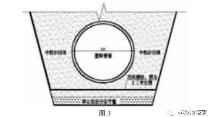 (3)目前很大范围上使用的管道基础仍为砂石基础,而“验收规范GB50268-2008”中只对压实度作适度要求,缺少对管道基础回填土整体性采取有效处理的要求,这可能导致回填土在特殊环境下流失,使管道前后沉降不一、接口错位,最终致使管道破裂而发生渗漏。可采取的措施如:塑料管道基础可在沿沟槽纵、横向用土工布加固,保证管基的整体性,避免前后的不均匀沉降,如图3。