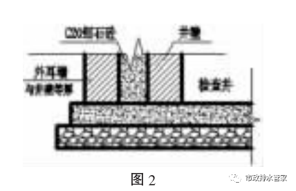 (2)管道与检查井的连接处理,通常的做法是在井壁范围做防漏处理,此种做法可以明显看到,管道基础和检查井基础缺少一个过渡段,引起不均匀沉降。而在检查井外围增加一道混凝土加砖砌墙,可适度减小前后的不均匀沉降,如图2。